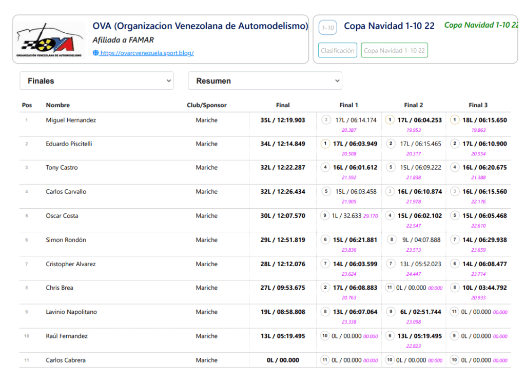 Y acá los resultados de ésta Copa Navidad que se celebra todos los años al final de la temporada, ésta vez en las instalaciones del Mini Autódromo del Este en Caracas.